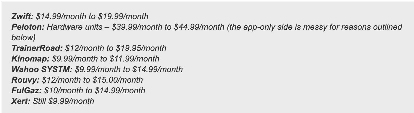 Zwift will cost you more $$$: Beginning June 6th, Zwift is raising it’s price for all members. That a 33% increase and for those in the US, you’ll go from $14.99 to $19.99 for monthly subscriptions, and from $149.99 to $199.99 for annual subscriptions. DC Rainmaker did a good job pulling together pricing for all your typical training platforms these days. Read more…