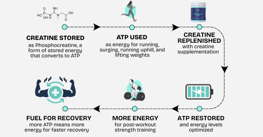 Stick with me. The more creatine stored means more phosphocreatine on deck, which means ATP gets rebuilt faster, which means you hold intensity longer before the wheels start to come off.