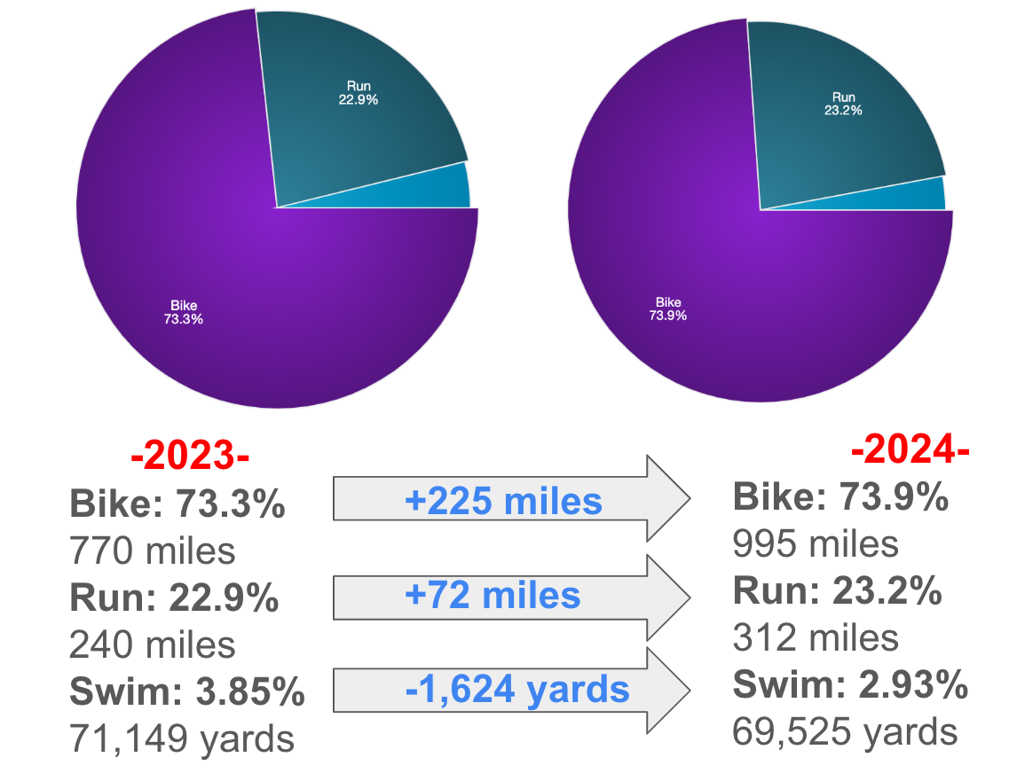 Overall, I’m an 11-13 hours of training guy but mostly stick to 11h a week. And because data is fun, let’s look at my year-over-year numbers. When analyzing the same timeframe of January 1st to the day before IM Galveston, percentage wise, I didn’t do much different. But as the numbers show, I did cycle more, and saw a slight uptick in my running, while my swimming decreased. In 2023, I was swimming 3 days-a-week swim but brought it down to mainly 2 days this go around. That was a strategic move to focus on getting stronger in the other two disciplines.