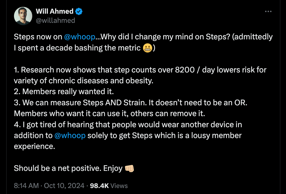 WHOOP gets its Steps In: I do not own a WHOOP but am really into the business and Will Ahmed as a leader. So when they were always resistant to having steps, it felt kind of weird. If there is one data point consumers understand it is… STEPS! But this week, Will announced that he is listening to his members and added the feature. Read more…