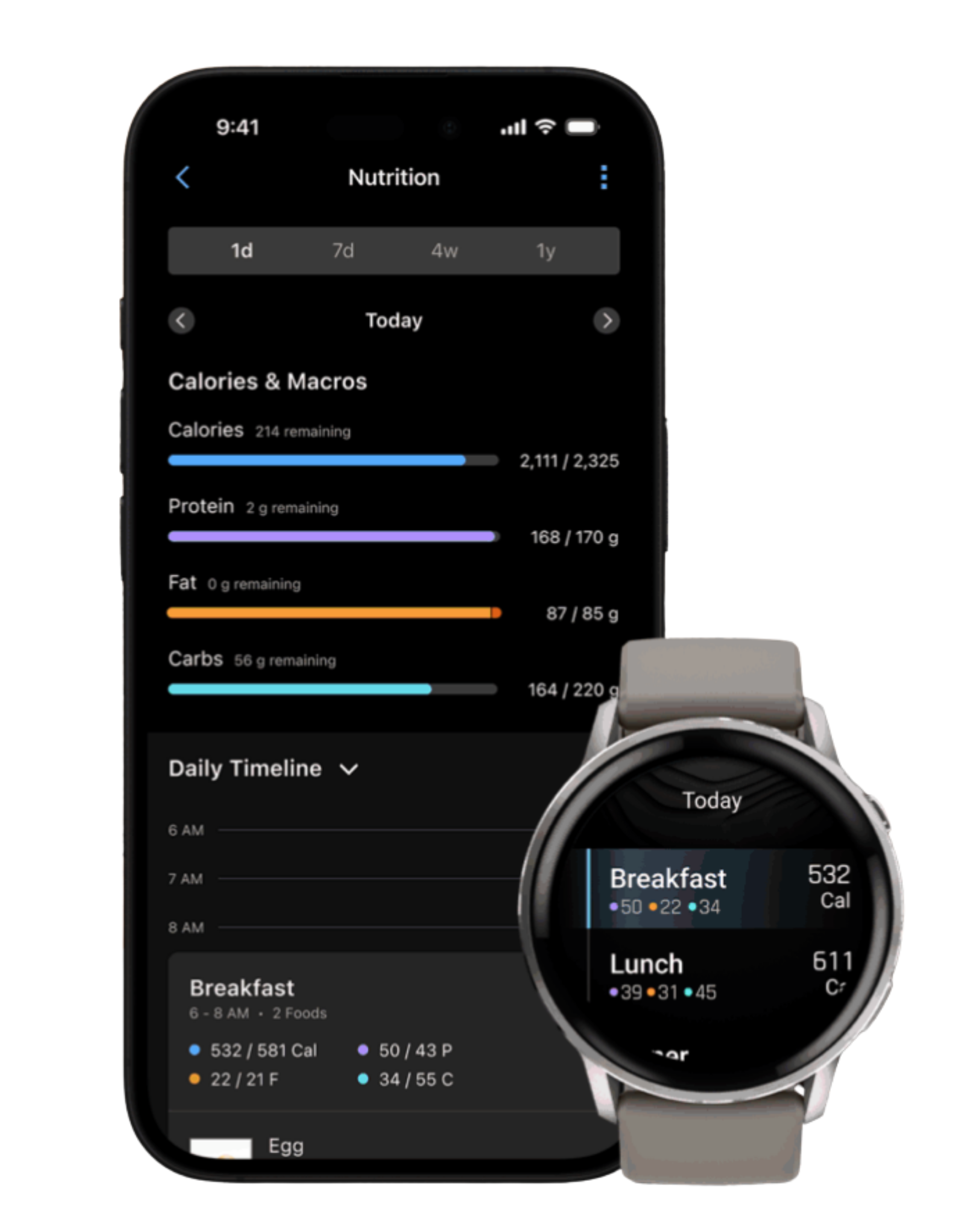 Garmin’s new Nutrition tracking allows users to log food and drink intake along with calories and macros (carbs, protein, fats) directly within the Garmin Connect app.