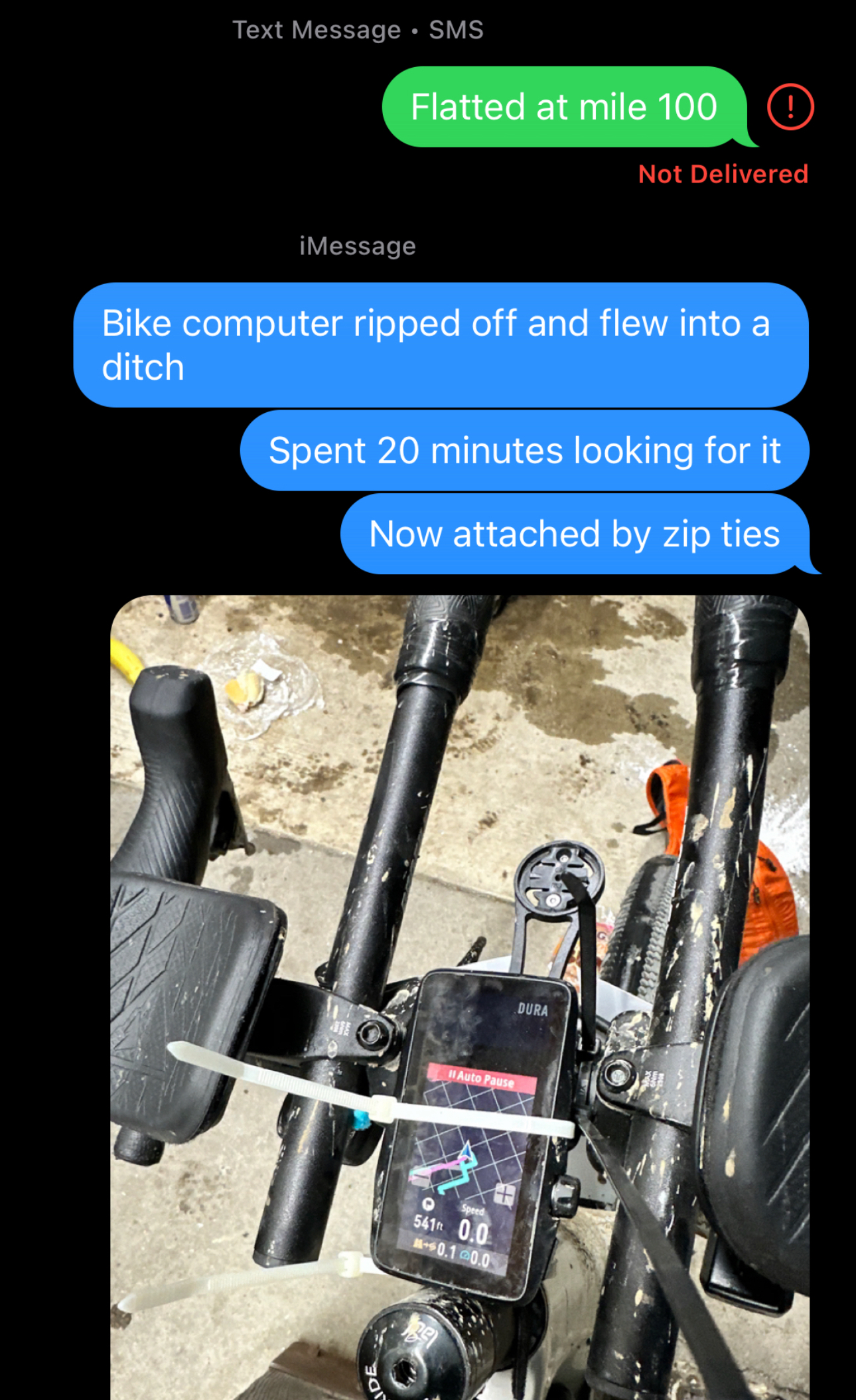 I bunny hop something, land and my bike computer mount breaks. I see my computer fly off into a ditch. I slam on the breaks knowing I am completely fucked without my mapping. Yes, I can use my phone (I guess) but I need to find the computer.