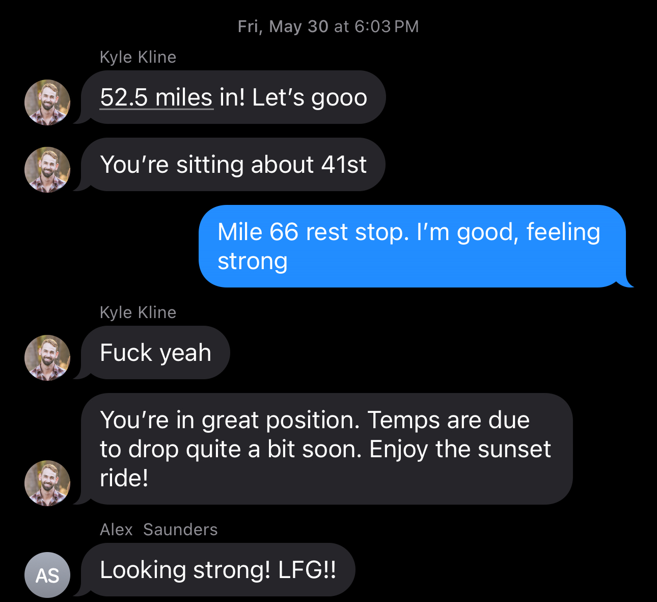 Mile 222. I caught up to a small pack that included Shawn and Bracken from CO, Timo from Canada, and Rachel from Naples, Italy. They were the most important people in my life at that moment. They’re positivity and camaraderie pushed me through. They welcomed me as if I was a lost lion cub searching for a new pride. Shawn gave me a powered donut and some ibuprofen. Rachel took long pulls in the front. Bracken and I talked about Austin and his remote work there. We became instant friends and not a group I’ll ever forget. We got through the final two aid stations and headed home for the last long 80 miles together.