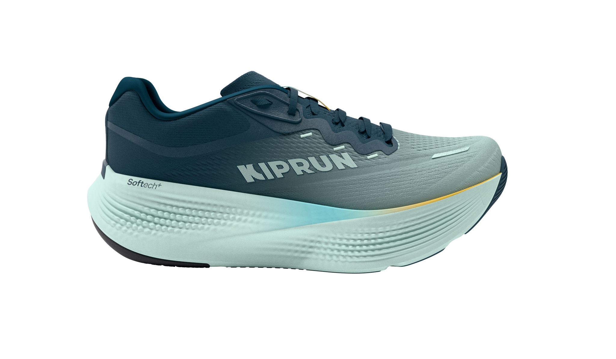 At the center of the shoe is SOFTECH+ which is KIPRUN’s new midsole foam, an EVA/PEBA/OBC blend delivering a full 42 mm stack height at the heel.