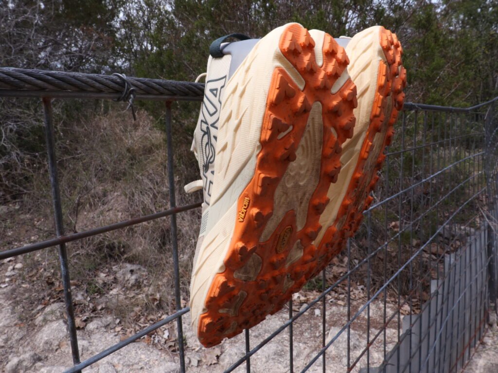 Traction: The Speedgoat line has a long history of being able to handle real trail conditions, and the 7 stays true to that. Regardless of whether I was in Texas, Arkansas, Nashville, or Asheville, this is a shoe for technical terrain that inspires confidence across anything thrown at it. HOKA updated the lug pattern here and the Vibram Megagrip, still 5mm lugs, combined with small traction dots around the outside of each lug adds nice surface area contact. In practice that showed up in how it handled terrain transitions across the four-state test. There was no point where I felt under-shoed. Even when I was sliding down loose limestone, my feet never slipped, even if my body was being thrown forward.