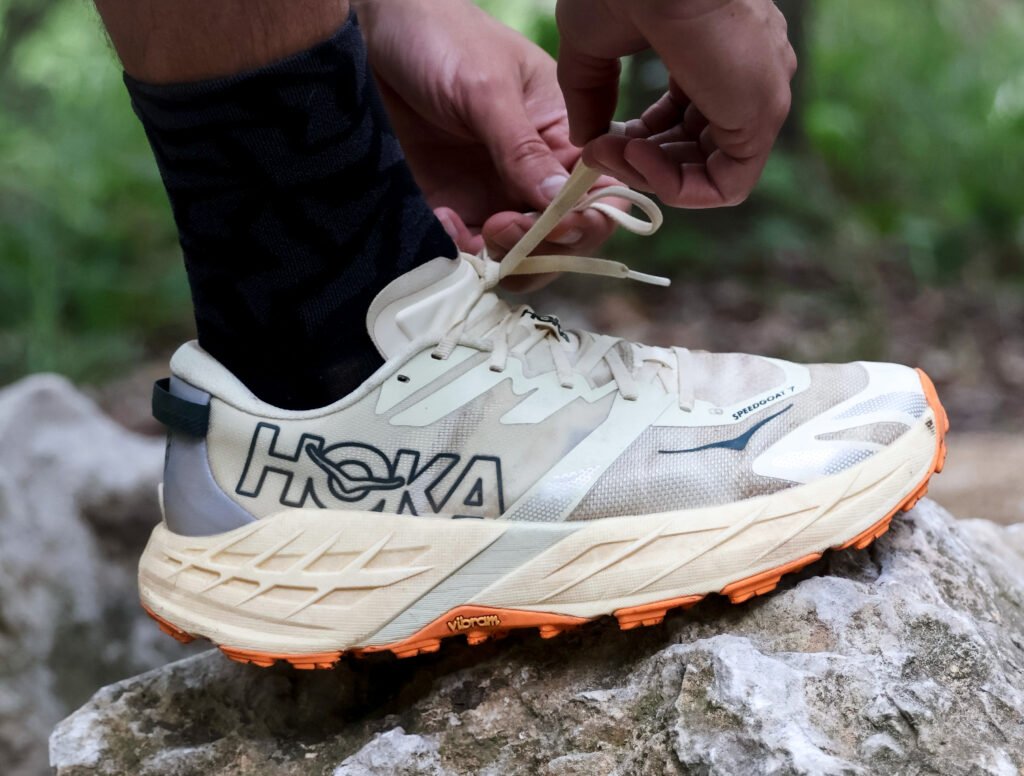 Once I did, the Speedgoat 7 really earned its reputation. The upper lockdown and midfoot hold are excellent, and the shoe stays planted even when things get unpredictable. The Vibram outsole gave a ton of confidence — loose dirt, packed trail, the sketchy sections that made me second-guess my next step. I never felt like I was fighting the shoe.
