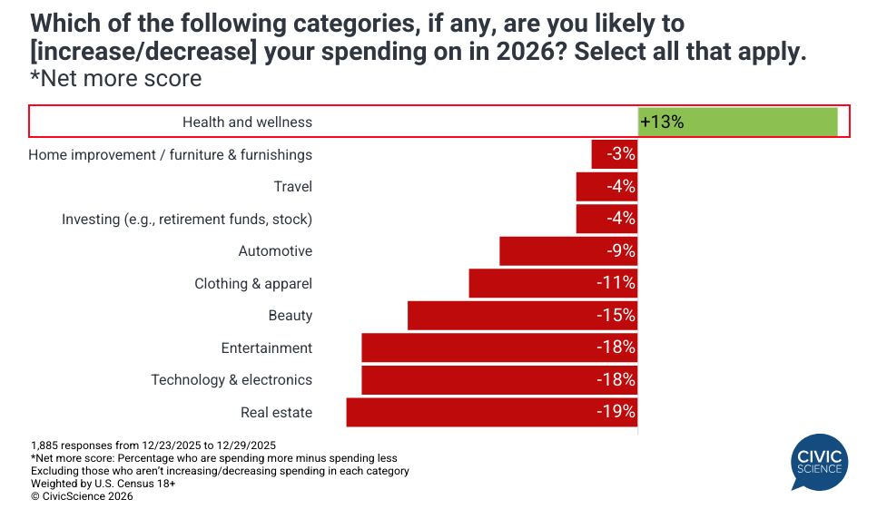 Look at the chart: health and wellness is the only category where consumers plan to increase spending in 2026. In every other category—from home improvement and travel to clothing and investments—people are cutting back.